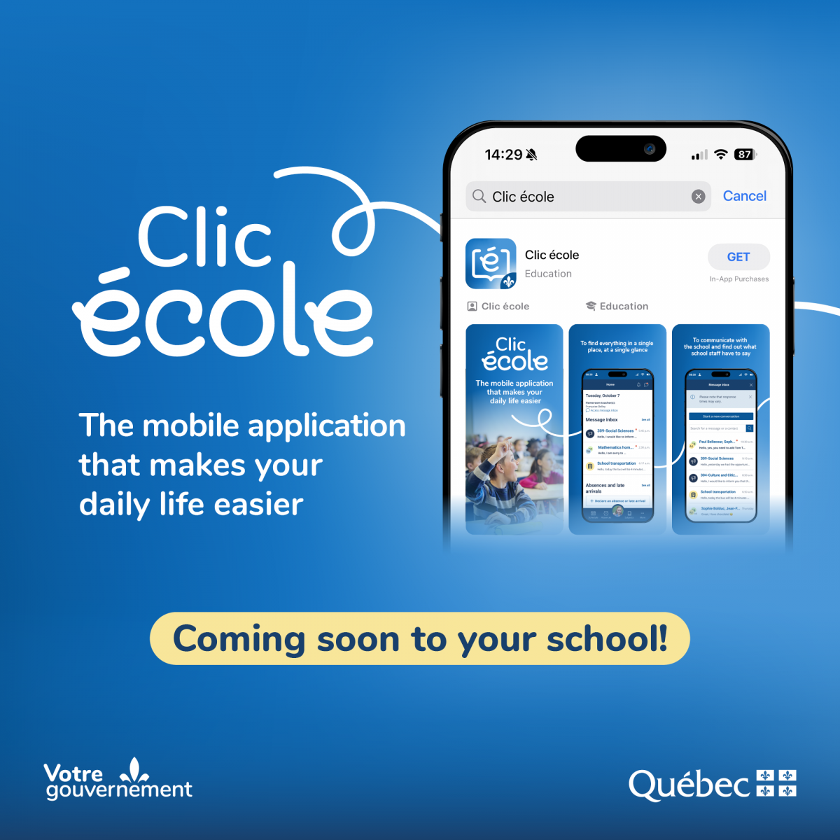 Clic école is a new app that will allow parents to see the school calendar, find homework, activities and evaluations. It will allow you to notify the school of an upcoming absence or view the record of absences and late arrivals. It will also allow them to consult official documents such as report cards, tax slips and statements of accounts.